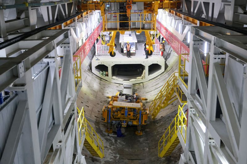 2024年2月16日,中鐵十四局集團的建設(shè)者在京唐城際鐵路運潮減河隧道施工。新華社記者 邢廣利 攝