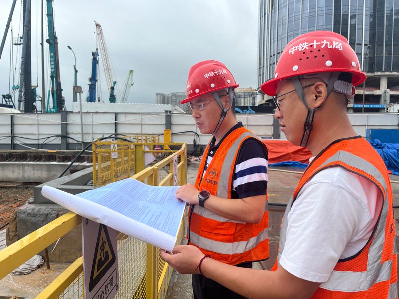 2024年4月26日,深圳市五一勞動獎?wù)芦@得者、中鐵十九局軌道公司項目副經(jīng)理夏荔(左)在穗莞深城際鐵路前皇段皇崗口岸站建設(shè)現(xiàn)場忙碌。新華社發(fā)