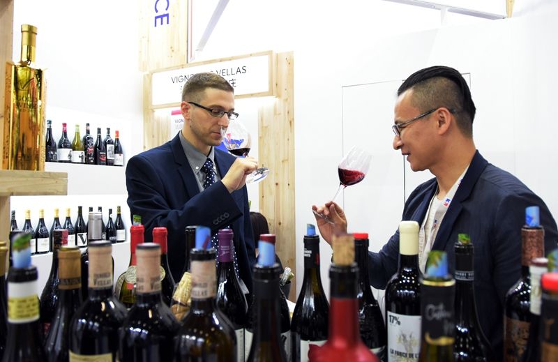 2021年6月1日,2021中國(北京)國際葡萄酒展覽會上,一名來自法國的參展商(左)邀請參觀者品鑒法國出產(chǎn)的葡萄酒。新華社記者 潘旭 攝